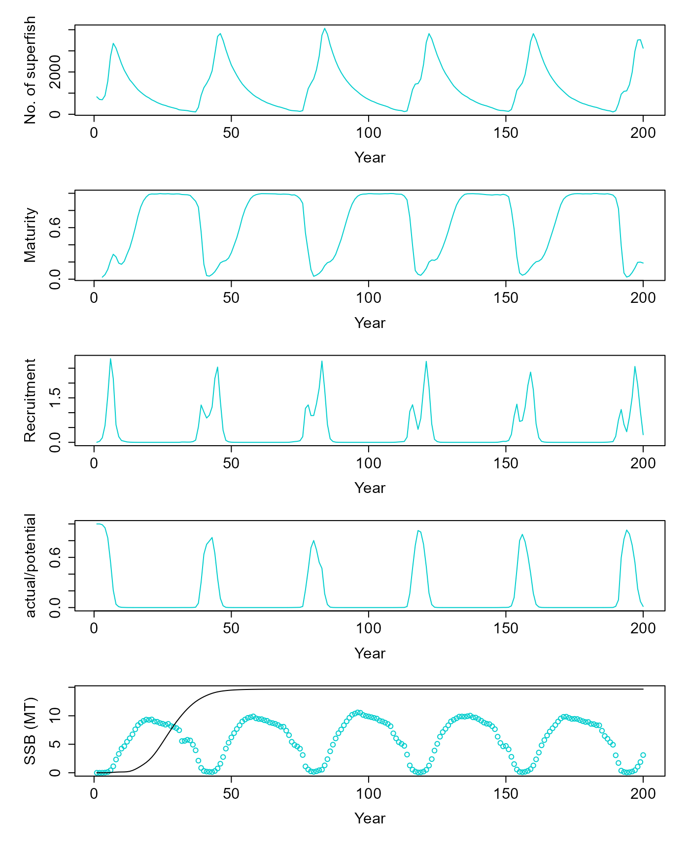 matplot(cbind(v$ssb/1e9, res$summaries$SSB[1:200]/1e9), ylab="SSB (MT)", xlab="Year", col=c("cyan3", "black"), lty=1, type=c("p","l"), pch=1)