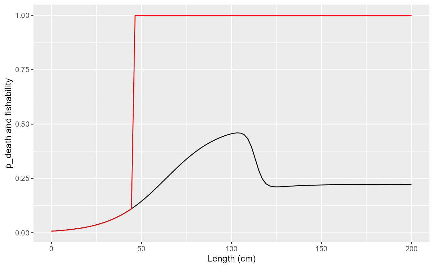 labs(x="Length (cm)", y="p_death and fishability")