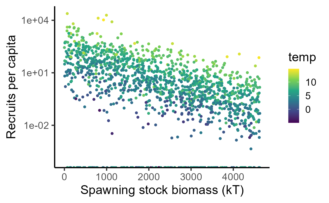 dat_full %>% ggplot(aes(x=ssb, y=fec)) + geom_point(aes(col=temp)) + scale_colour_viridis_c() + labs(x="Spawning stock biomass (kT)", y = "Recruits per capita") + theme_classic(base_size=20) + scale_y_log10(limits = c(1e-4, NA)) ## Warning in scale_y_log10(limits = c(1e-04, NA)): log-10
