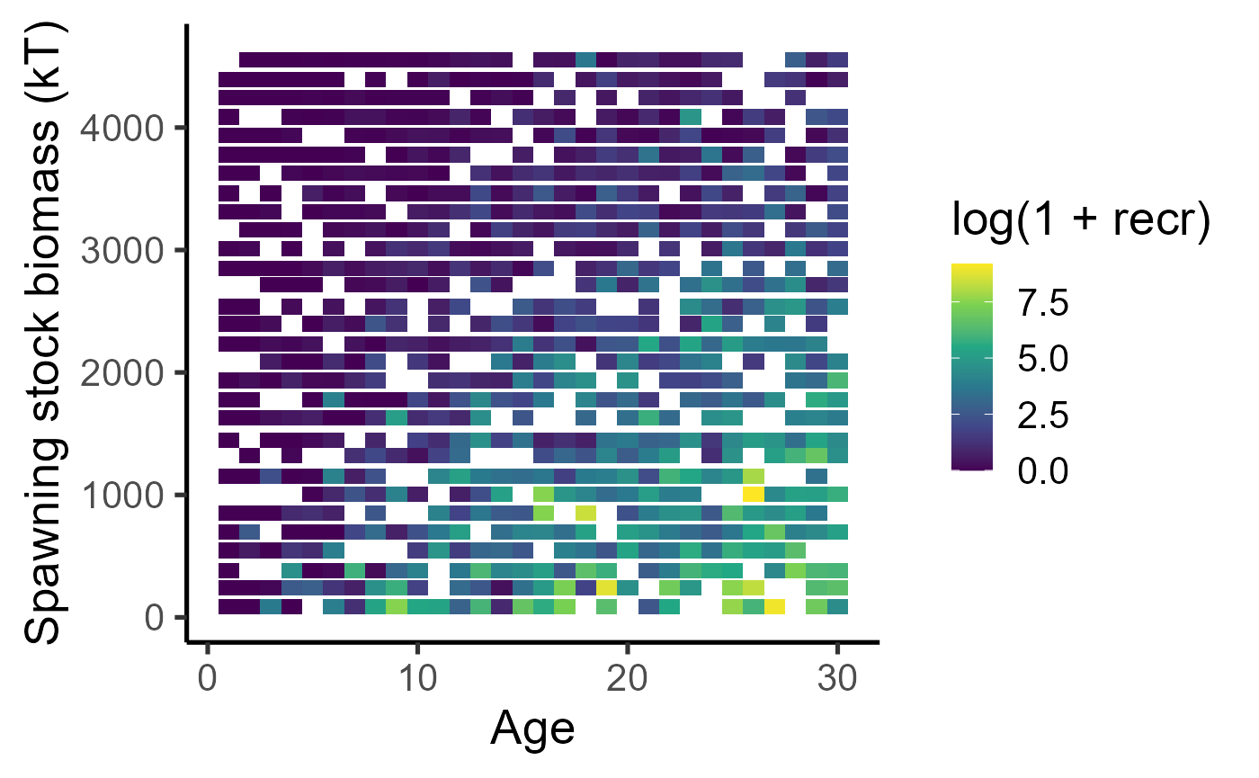 ggplot() + geom_tile(aes(x=age, y=ssb_class, fill=log(1+recr))) + scale_fill_viridis_c() + labs(y="Spawning stock biomass (kT)", x = "Age") + theme_classic(base_size=20)## `summarise()` has grouped output by 'age'. You can override using the `.groups`