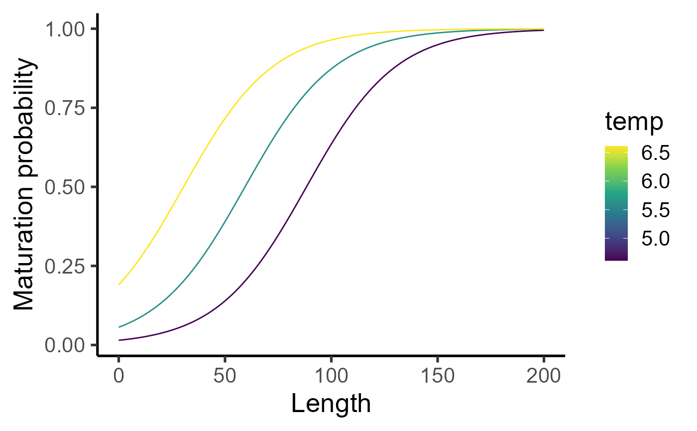 Decision to mature is defined by a probabilistic maturation reaction norm (PMRN), with a probability of maturing in the next year depending on age , length , and temperature , given by the following equation,