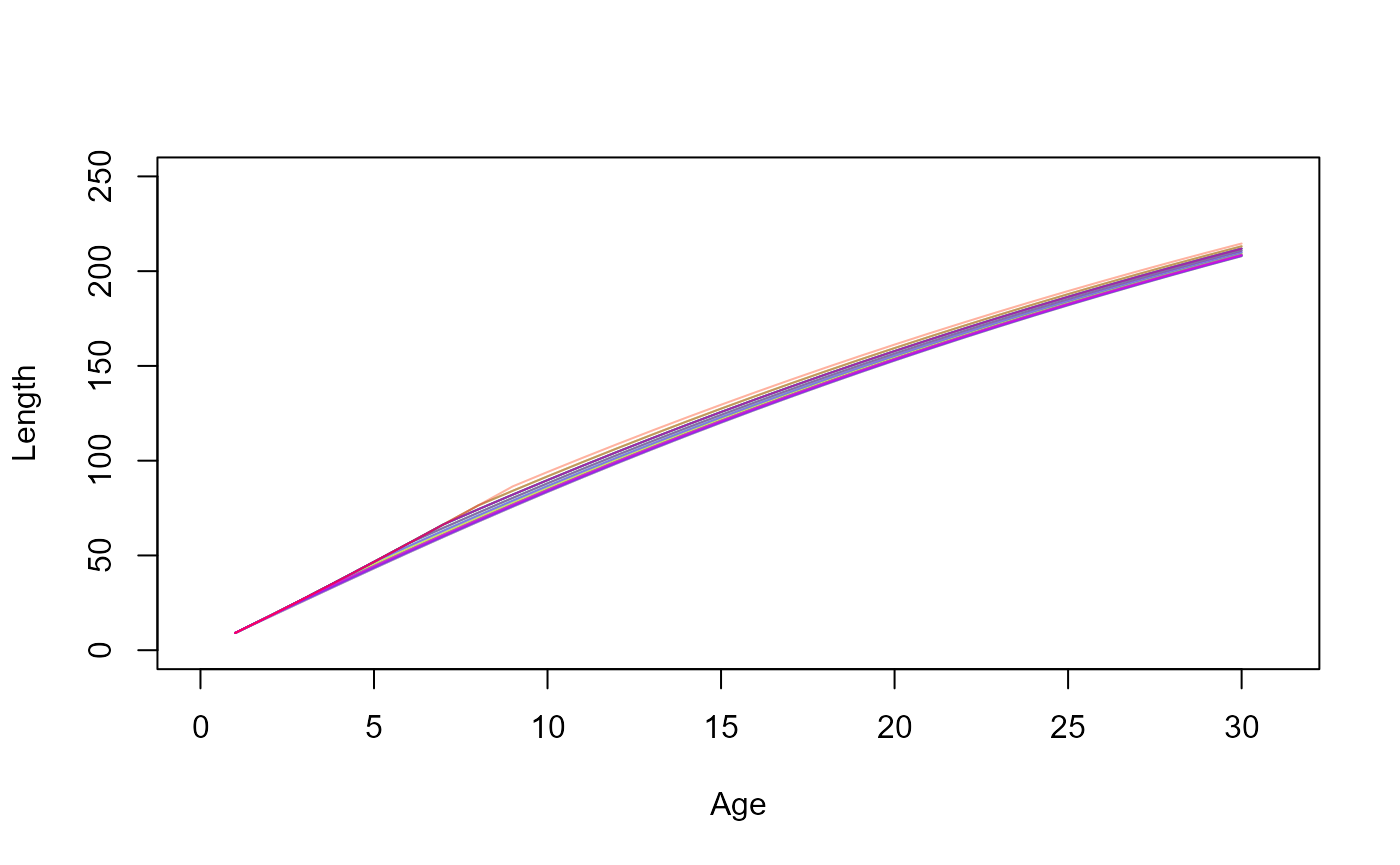 Now, since the growth trajectory of a fish depends on the age at which it matures, and since maturation is a random process, let us simulate lots of fish and look at the possible growth trajectories.