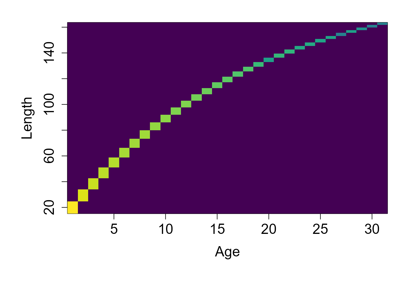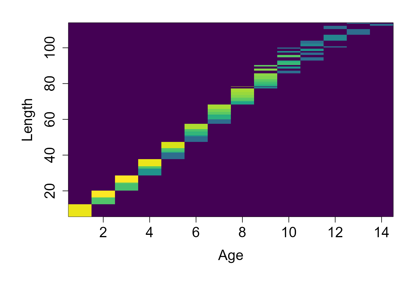 image(x=as.numeric(rownames(dist)), y = as.numeric(colnames(dist)), z=log(1+3*log(1+dist)), col=scales::viridis_pal()(100), xlab="Age", ylab="Length")