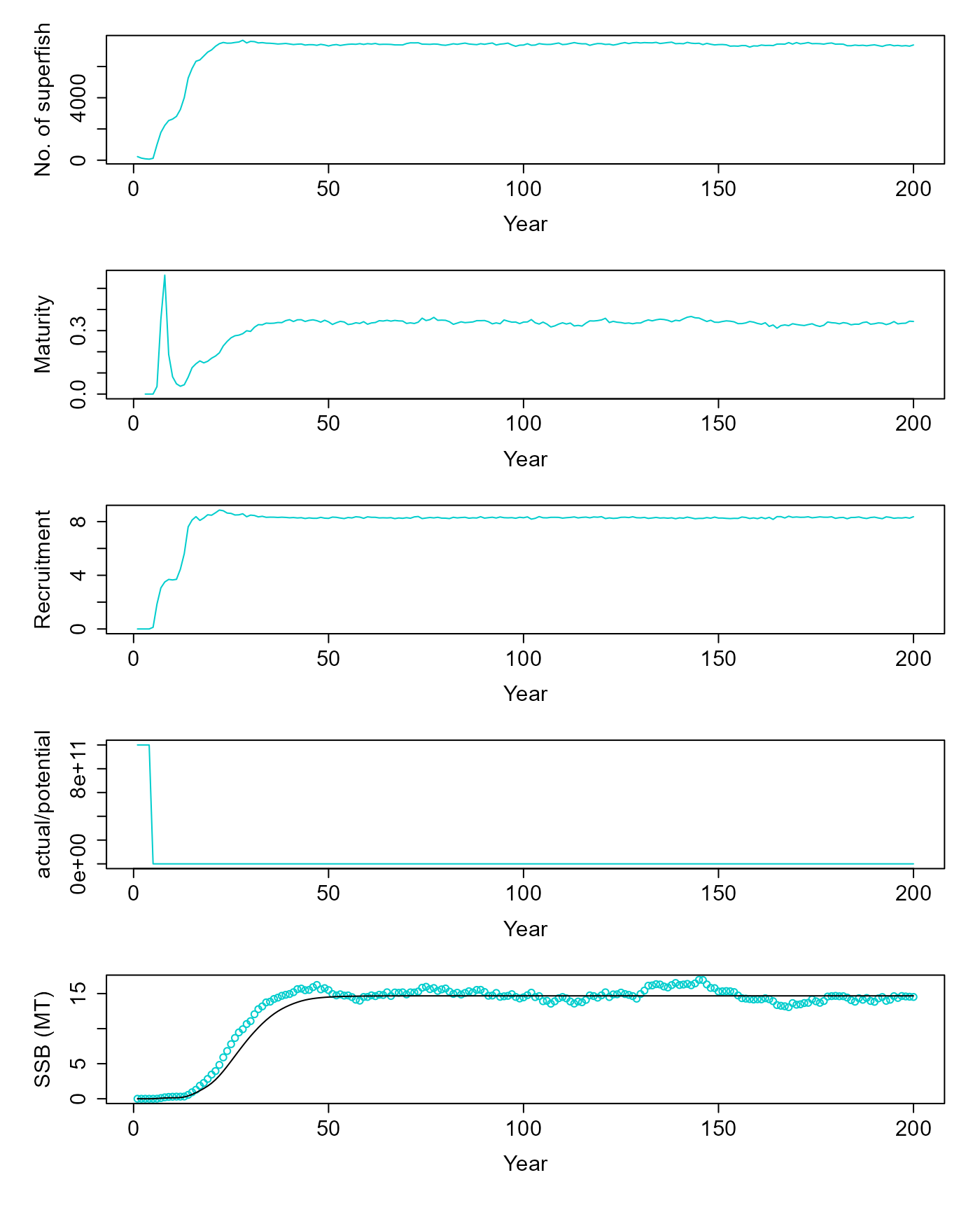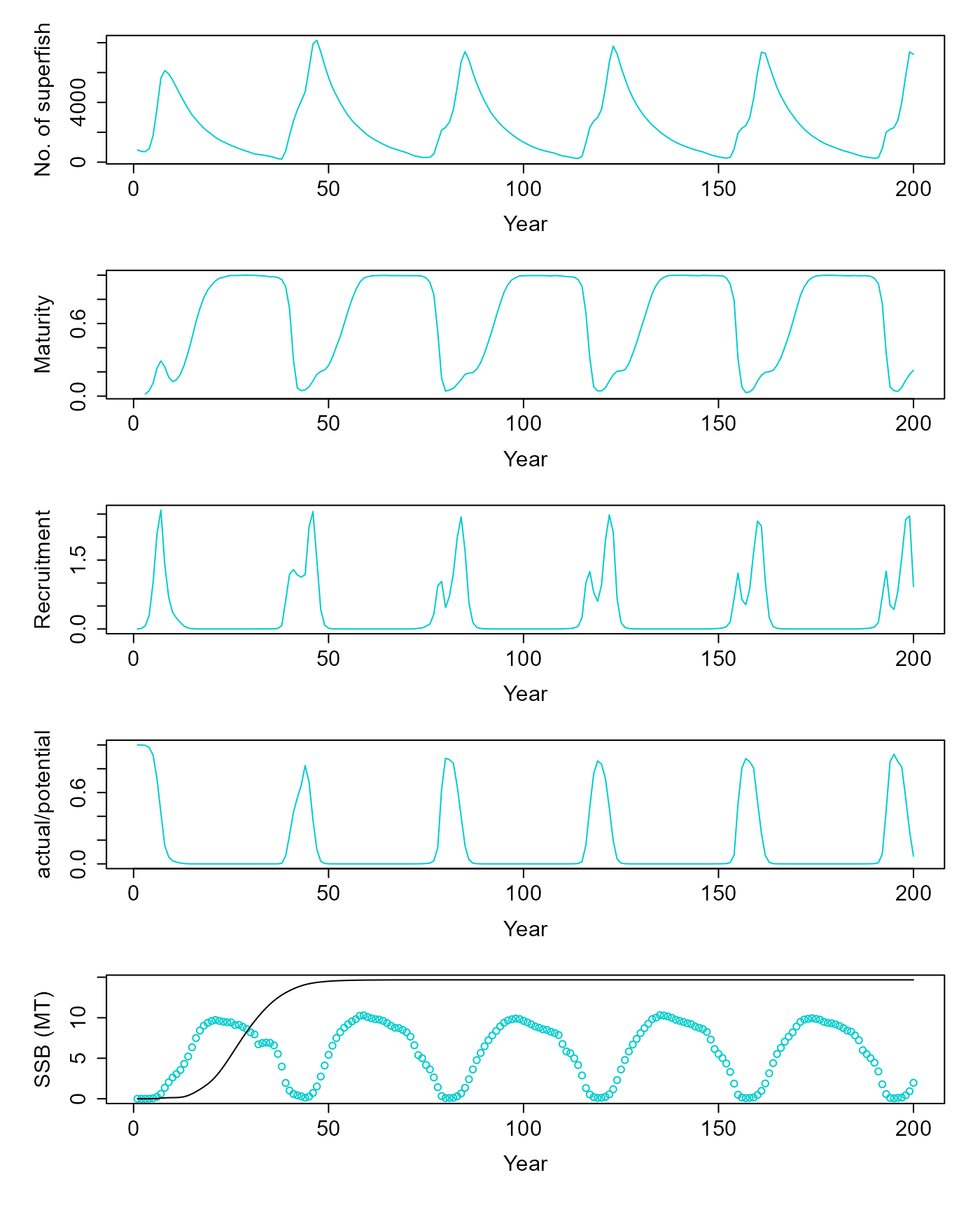 v = pop$equilibriate_without_fishing(5.61) |> matrix(nrow=200, byrow=T) |> as.data.frame() |> setNames(c("ssb", "tsb", "maturity", "nr", "dr", "nfish"))